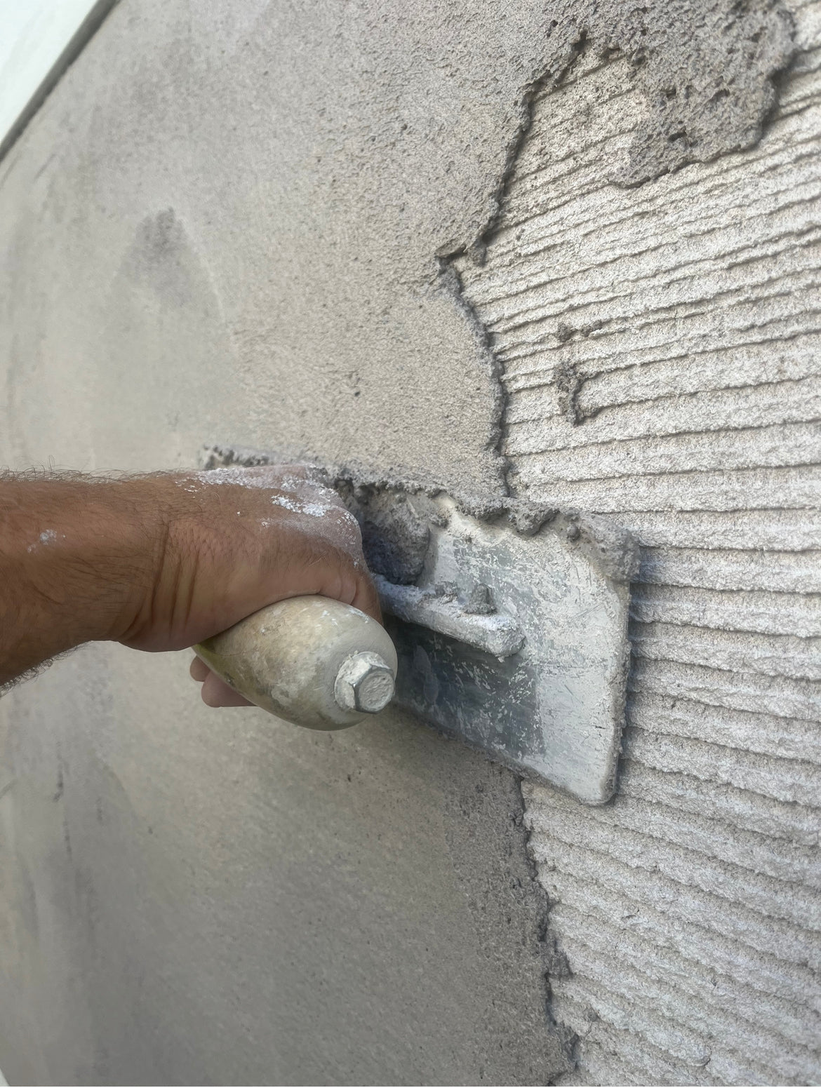 Scratch Coat Application: The scratch coat functions to create a mechanical bond to the substrate and give texture (tooth) for the brown coat. The scratch coat is horizontally scratched with a scarifier tool.