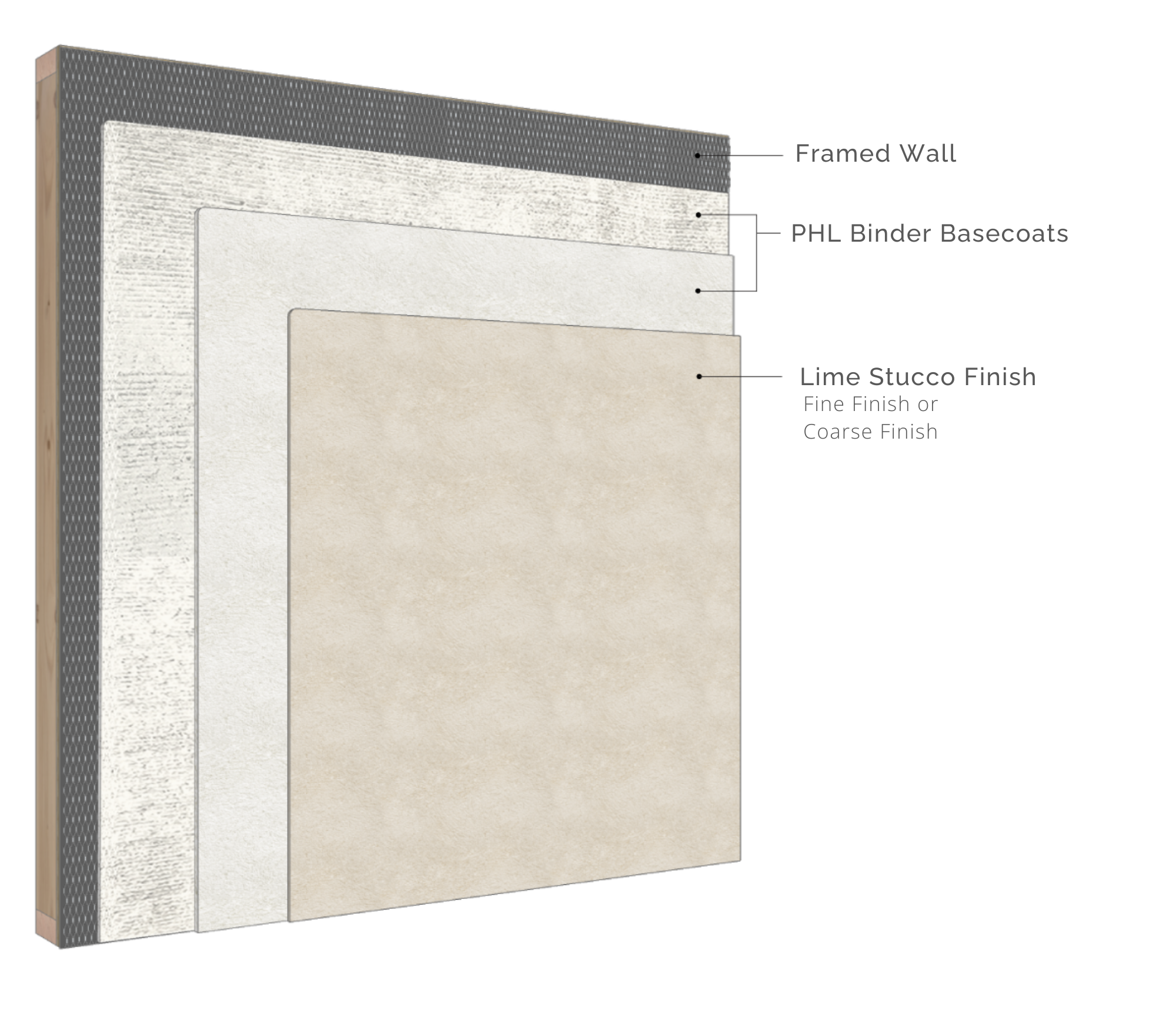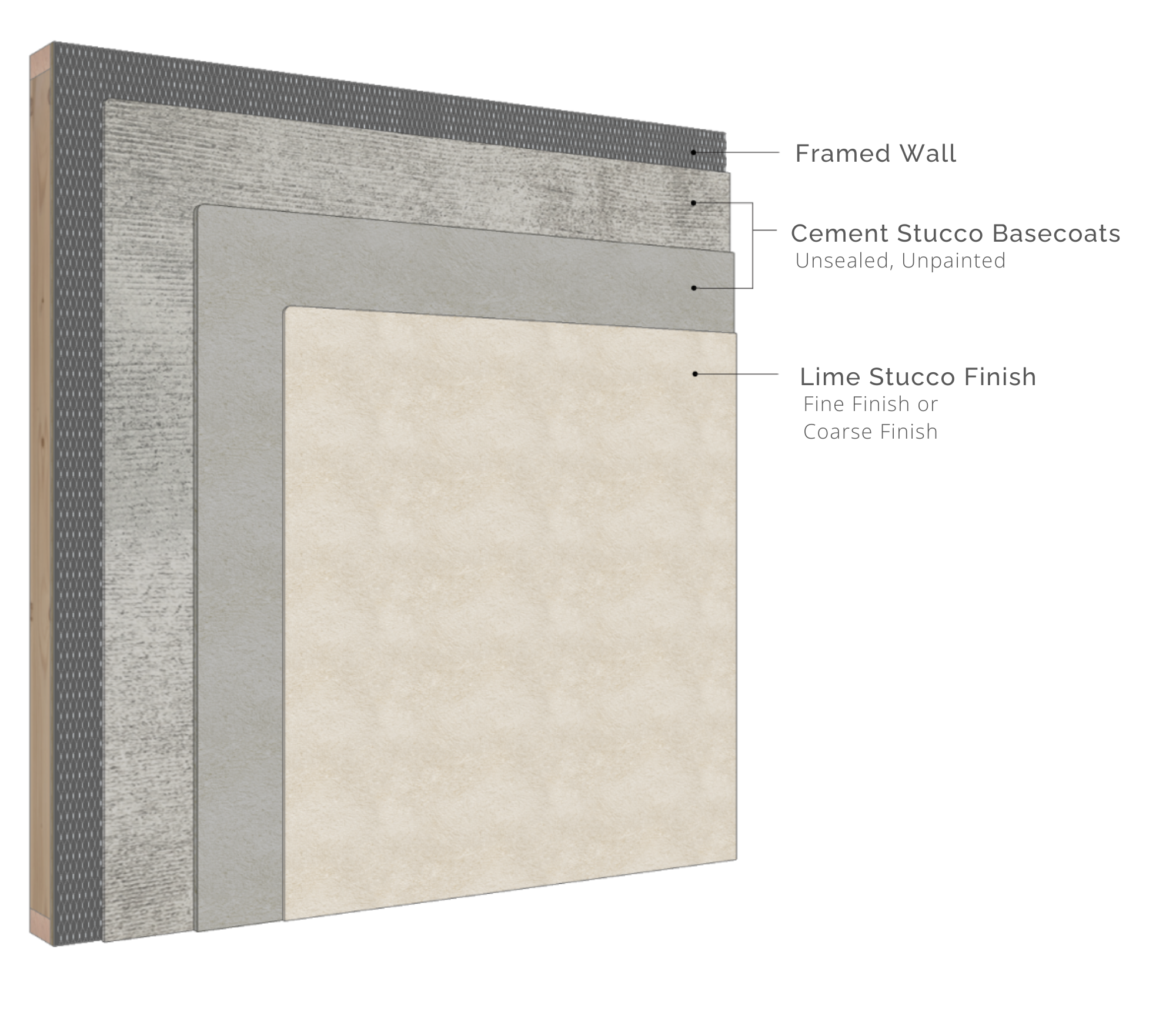 Earthaus Lime Stucco Finishes can be applied over conventional framed wall assemblies. Framed walls—typically built with plywood sheathing, a weather-resistive barrier, and expanded metal lath—require a traditional scratch and brown base coat.